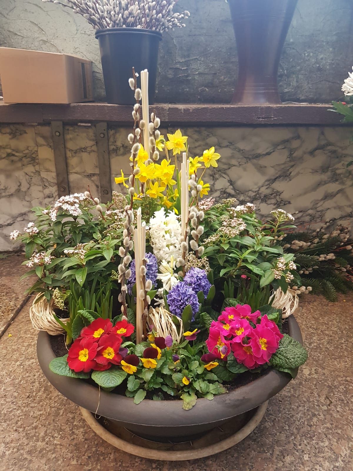 Im Sommer finden Sie eine breite Auswahl an Sommerblumen, während im Winter dauerhafte Gestecke oder Abdeckungen mit Tannen und Nadelbäumen angeboten werden.